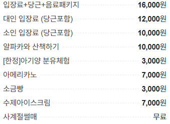 입장료는 대인, 소인 요금이 다르고 입장료 외에 알파카와 산책하기나 아기양 분유체험등
